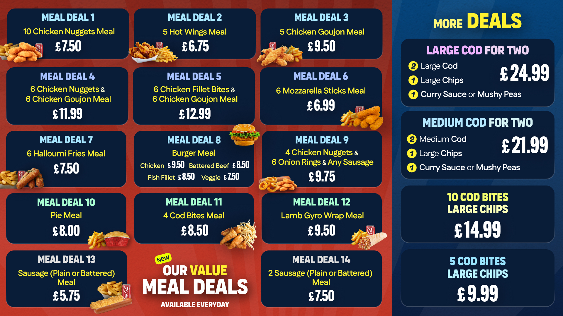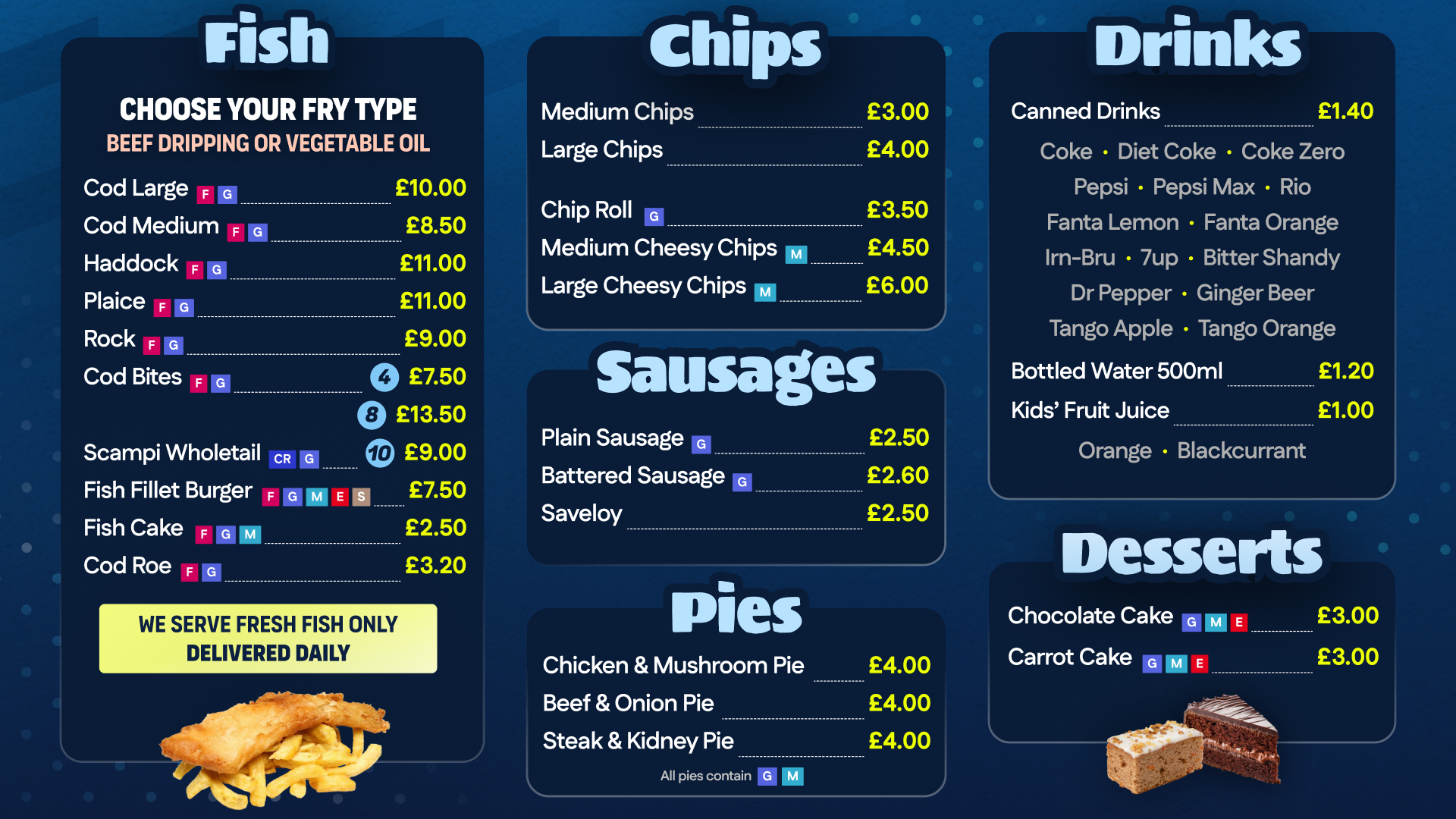 If you are looking to satisfy your craving for cod in a crispy batter, fluffy chips, mouthwatering gourmet burgers and other delicious dishes then you have found the right takeaway for you!